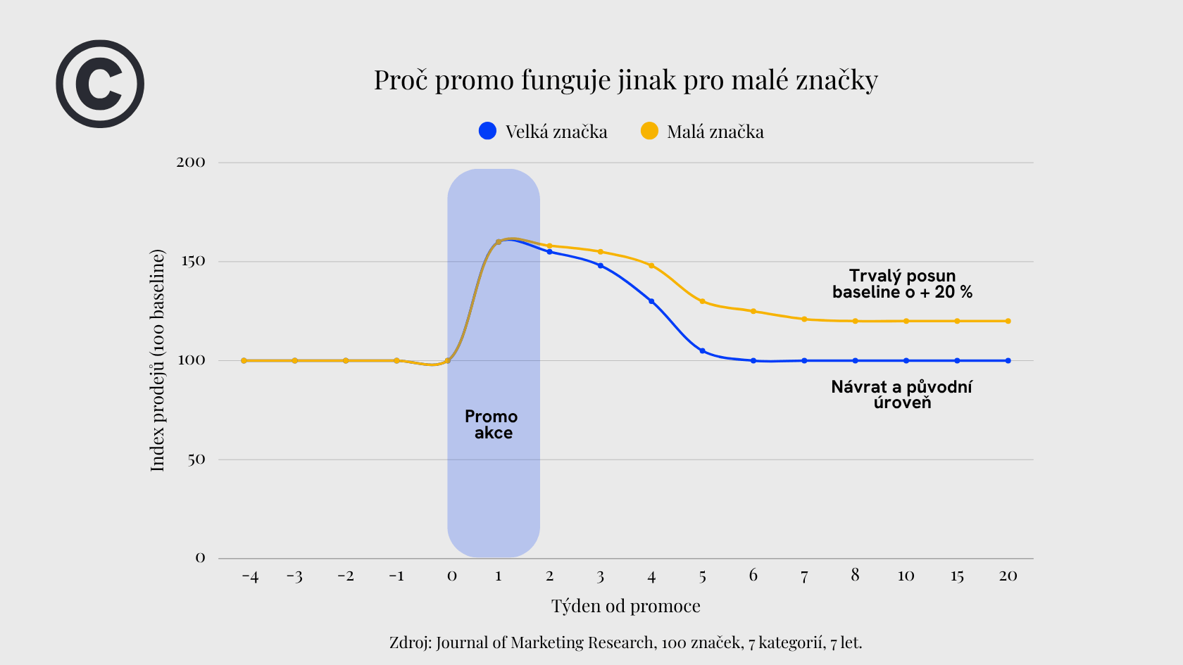 Proč? Protože u malé značky má zákazník nízkou předchozí zkušenost. Promo mu sníží riziko vyzkoušení (trial). A pokud je zkušenost dobrá, opakuje. U velké značky přišly veškeré trialy už dávno, proto promo jen přisune stávající zákazníky dočasně vpřed.