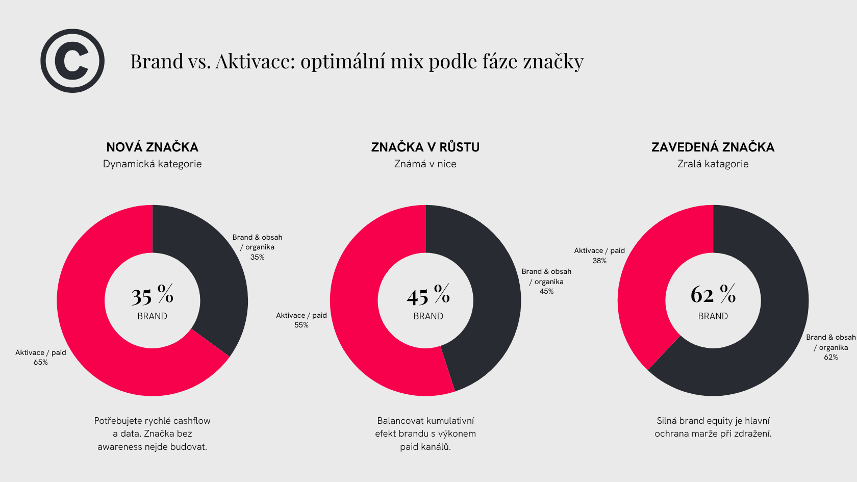 Značka v růstu, známá v niši | ~40–50 % brand / 50–60 % aktivace | Balancovat kumulativní efekt brandu (nižší CAC v čase) s krátkodobým výkonem | Když brand search roste stabilně a repeat rate je OK a můžete přidat brand |