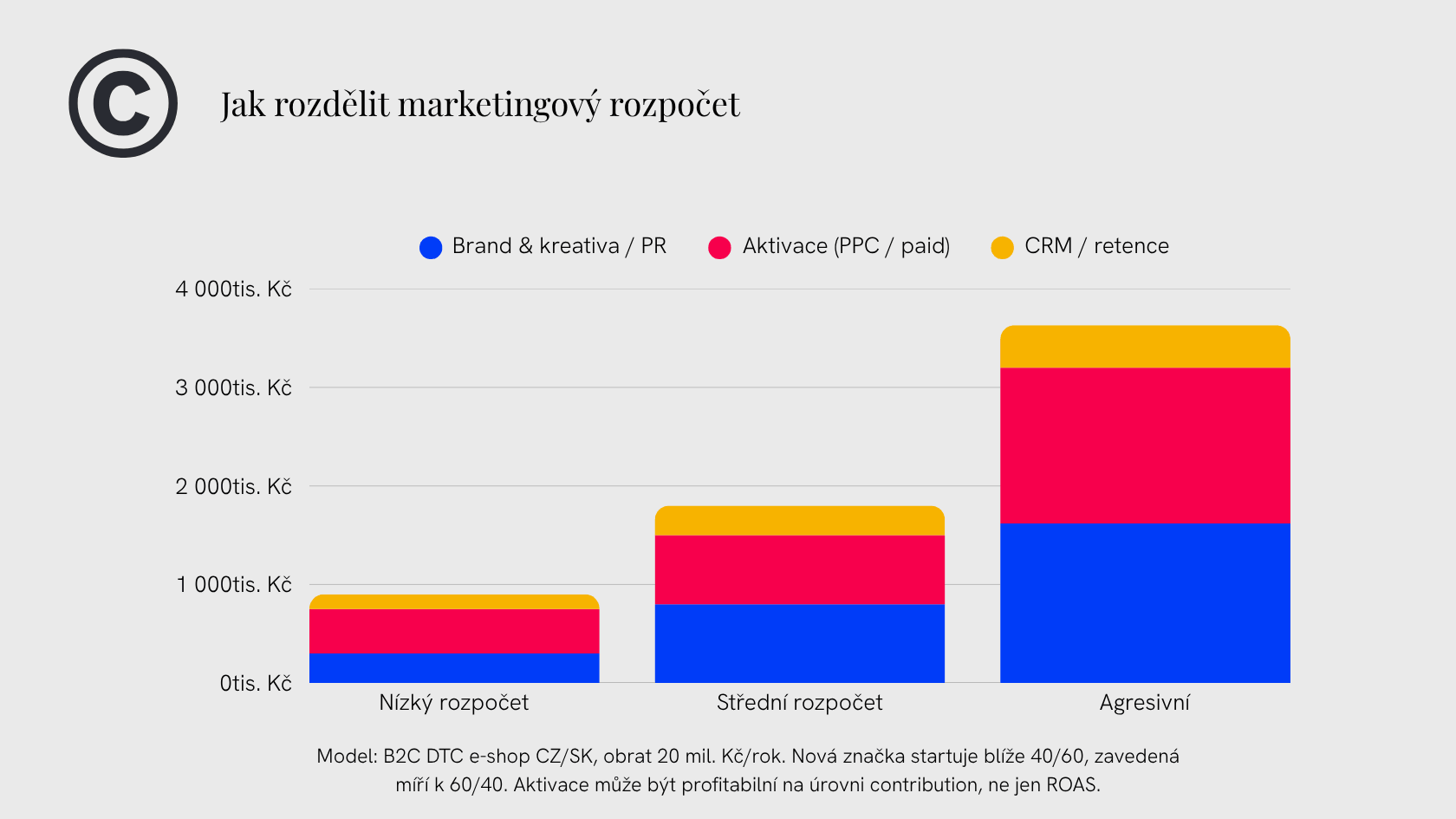 Brand & kreativa / PR / obsah | 300 000 | 800 000 | 1 620 000 | Podíl brand vs. aktivace závisí na fázi: nová značka startuje blíže 40/60, zavedená míří k 60/40. Bez kreativního systému je to chaos |